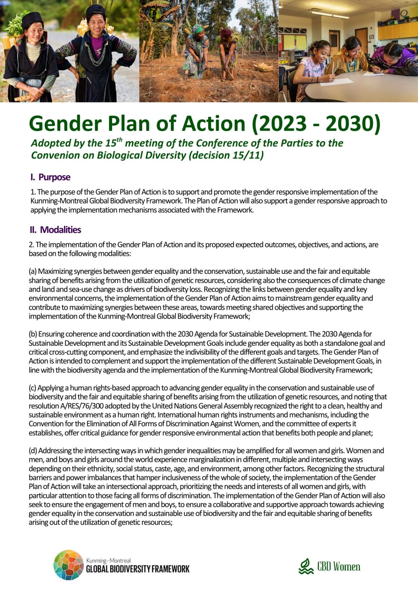 The purpose of the Gender Plan of Action is to support and promote the gender responsive implementation of the Kunming-Montreal Global Biodiversity Framework (COP15/11 p3).
